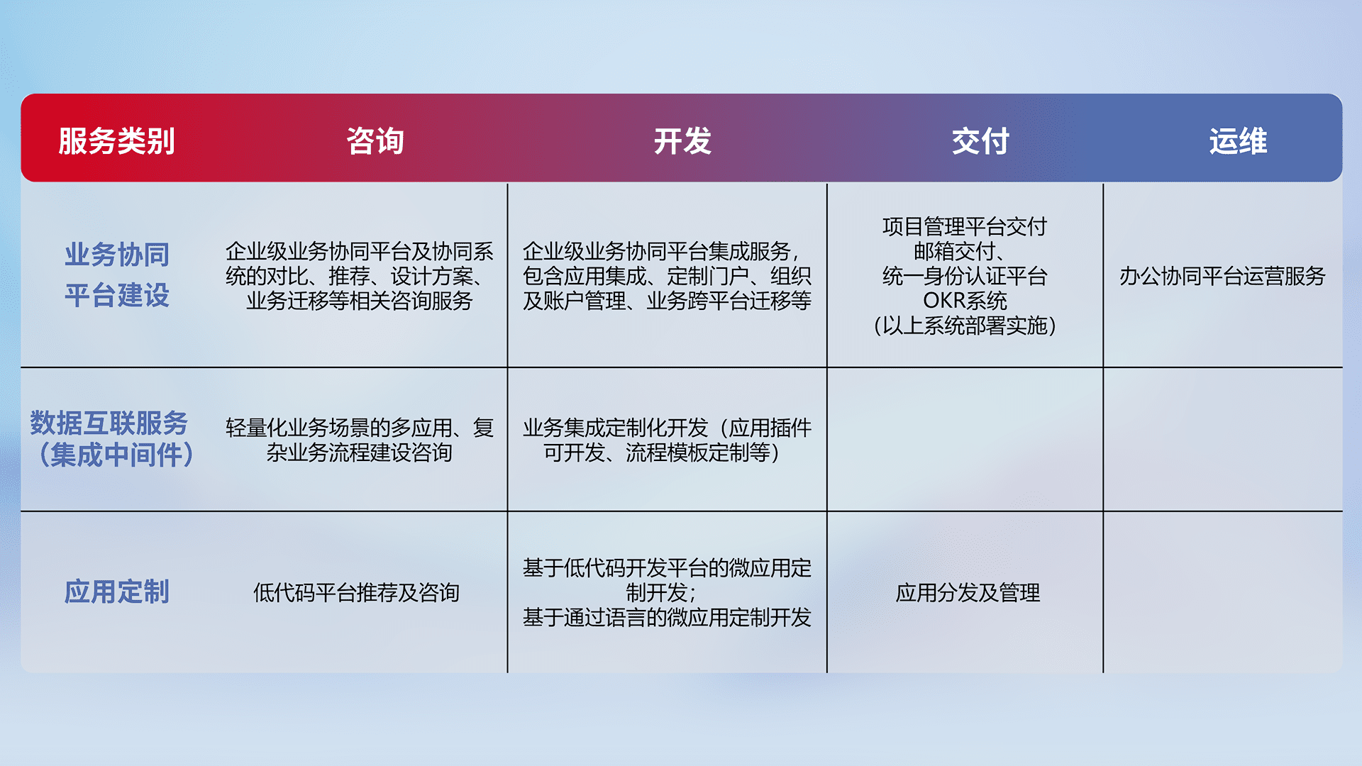 针对钉钉、、、企微、、、、IDaas等平台级产品提供产品的规划、、、、方案、、交付、、定制化开发等服务,,,,实现如统一协同办公、、、、智能客户服务、、、混合会议管理、、、智能数据查询、、等业务场景,,,实现数字化转型。。。。